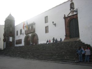 En su exterior destaca su torre con aspecto de fortaleza sólida construida en piedra volcánica negra, presenta en la ventana, coronada con un frontón triangular, relieves e inscripciones alusivas a una etapa de la historia de la isla.
