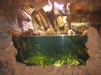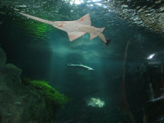 Oceánico.- Aquí, hay que pararse, sentarse y observar los bancos de júreles y de barracudas. Por debajo las rayas guitarra exploran los fondos. Pasamos al gran estanque de los tiburones. Por pequeños ojos de buey, a hurtadillas, el visitante se cruza con la mirada fija del señor de los Océanos.